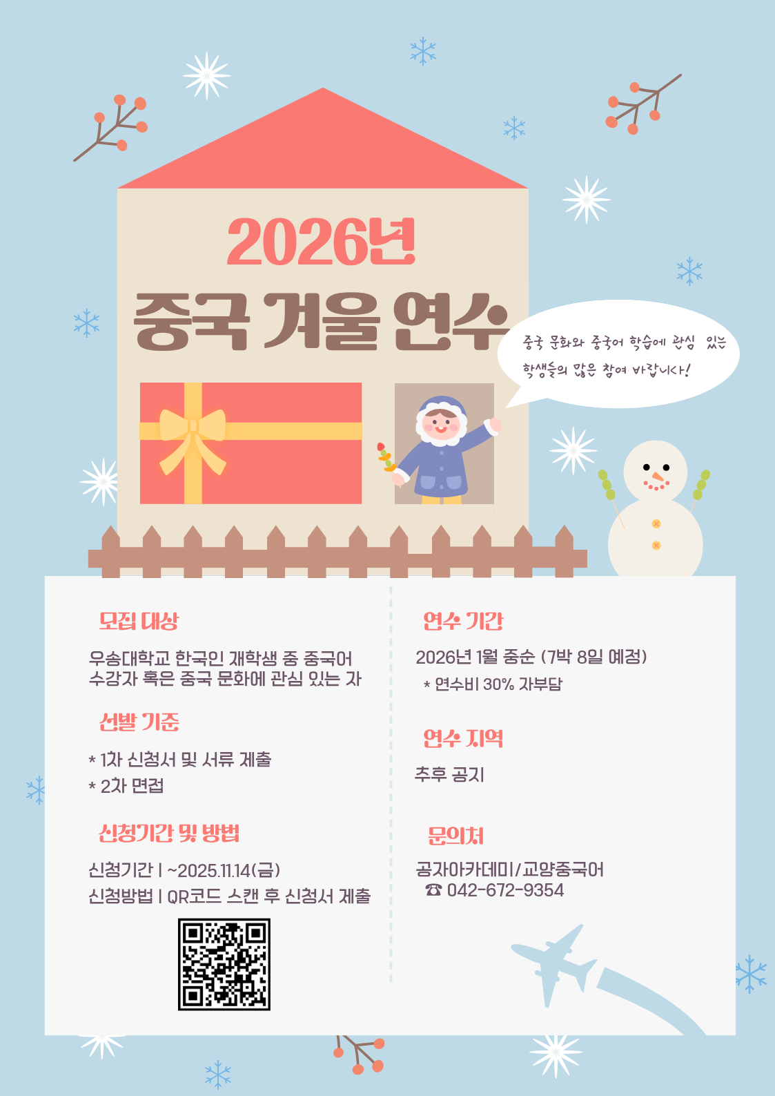 커뮤니티 공지사항 Q&A 자료실 자유게시판 포토갤러리 Home커뮤니티공지사항 공지사항 2025학년도 중국 겨울 연수 시행 안내 작성자 : 관리자 | 작성일 : 2025.11.03 | 조회수 : 5 ** 연수지역 및 자세한 일정은 2차 면접 진행 후 최종 선발된 학생들을 대상으로 진행하는 설명회에서 공지 예정입니다. 첨부파일 2025학년도 중국 겨울 연수 시행 안내.png 목록 이전글 이전 글이 없습니다. 다음글 2025학년도 2학기 한/중국어 시낭송대회 대회 일정 변경 안내