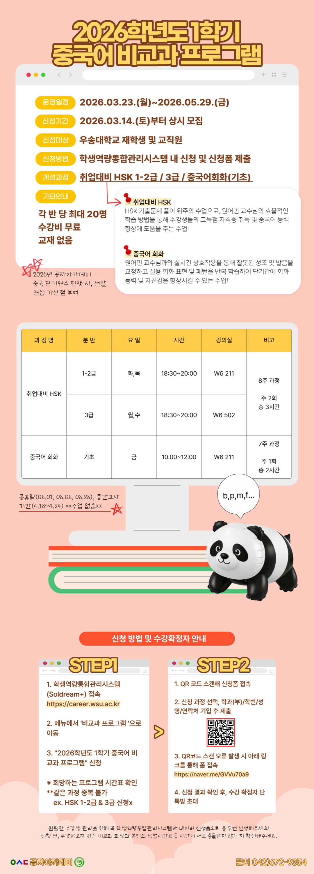 커뮤니티 공지사항 Q&A 자료실 자유게시판 포토갤러리 Home커뮤니티공지사항 공지사항 2026학년도 1학기 중국어 비교과 프로그램 신청 안내 작성자 : 관리자 | 작성일 : 2026.03.16 | 조회수 : 26 정확한 수강 신청 과목 확인 및 원활한 수강생 관리를 위해 반드시 우송대학교 학생역량통합관리시스템(http://career.wsu.ac.kr)에서 '2026학년도 1학기 중국어 비교과 프로그램' 신청 후 >>> https://naver.me/GVVu70a9 <<< 링크를 통해 네이버 신청폼도 제출해주세요! 첨부파일 2026학년도 1학기 중국어 비교과 프로그램 신청 안내(수정).png 목록 이전글 2026학년도 1학기 중국어 및 한국어 동아리 회원 모집 안내 다음글 2025학년도 중국 겨울 연수 시행 안내