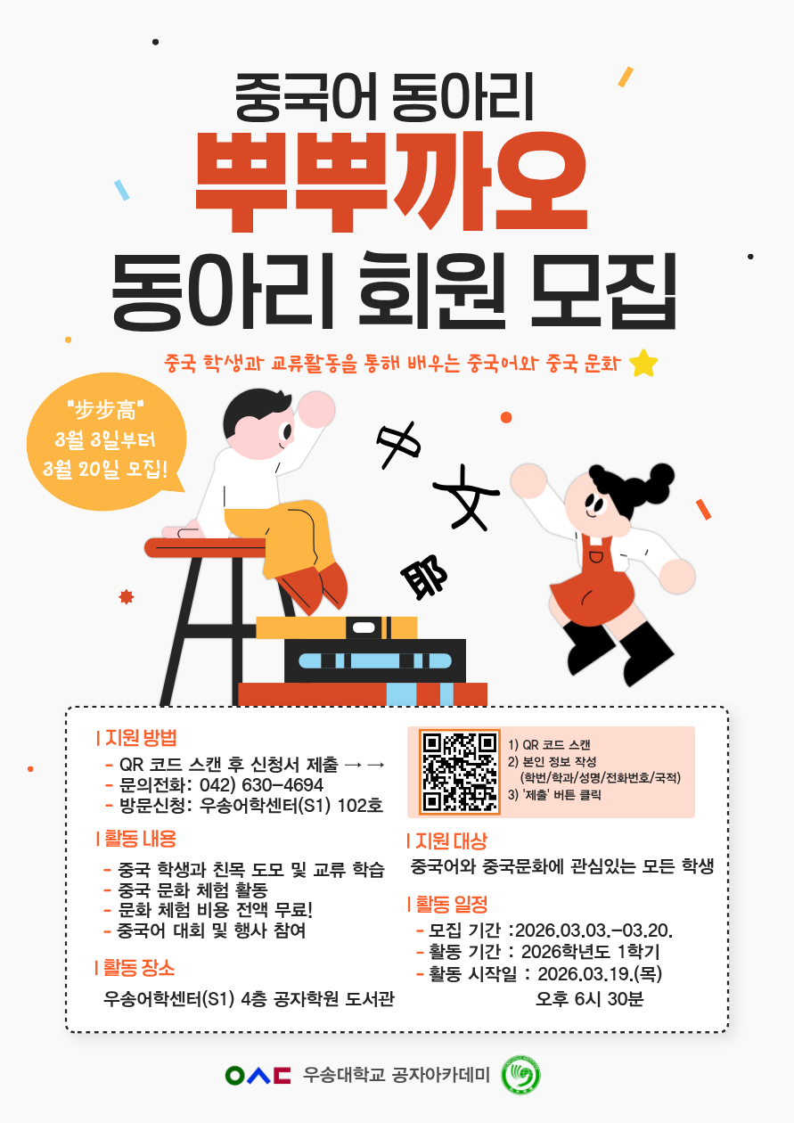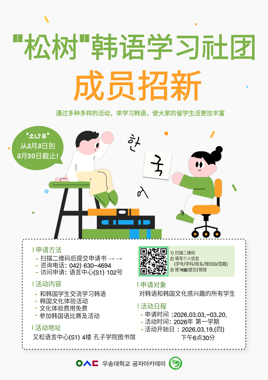 커뮤니티 공지사항 Q&A 자료실 자유게시판 포토갤러리 Home커뮤니티공지사항 공지사항 2026학년도 1학기 중국어 및 한국어 동아리 회원 모집 안내 작성자 : 관리자 | 작성일 : 2026.03.16 | 조회수 : 22 안녕하세요! 공자아카데미에서 2026학년도 1학기 중국어 동아리 뿌뿌까오(步步高)와 한국어 동아리 소나무(松树)의 회원을 모집합니다! 신청 방법은 아래 포스터에 나와 있으니, 중국 문화와 한국 문화에 관심 있는 분들의 많은 관심과 신청 바랍니다! 첨부파일 [1]26-1 중국어 동아리 뿌뿌까오 포스터.png [1]26-1 한국어 동아리 소나무 포스터.png 목록 이전글 이전 글이 없습니다. 다음글 2026학년도 1학기 중국어 비교과 프로그램 신청 안내